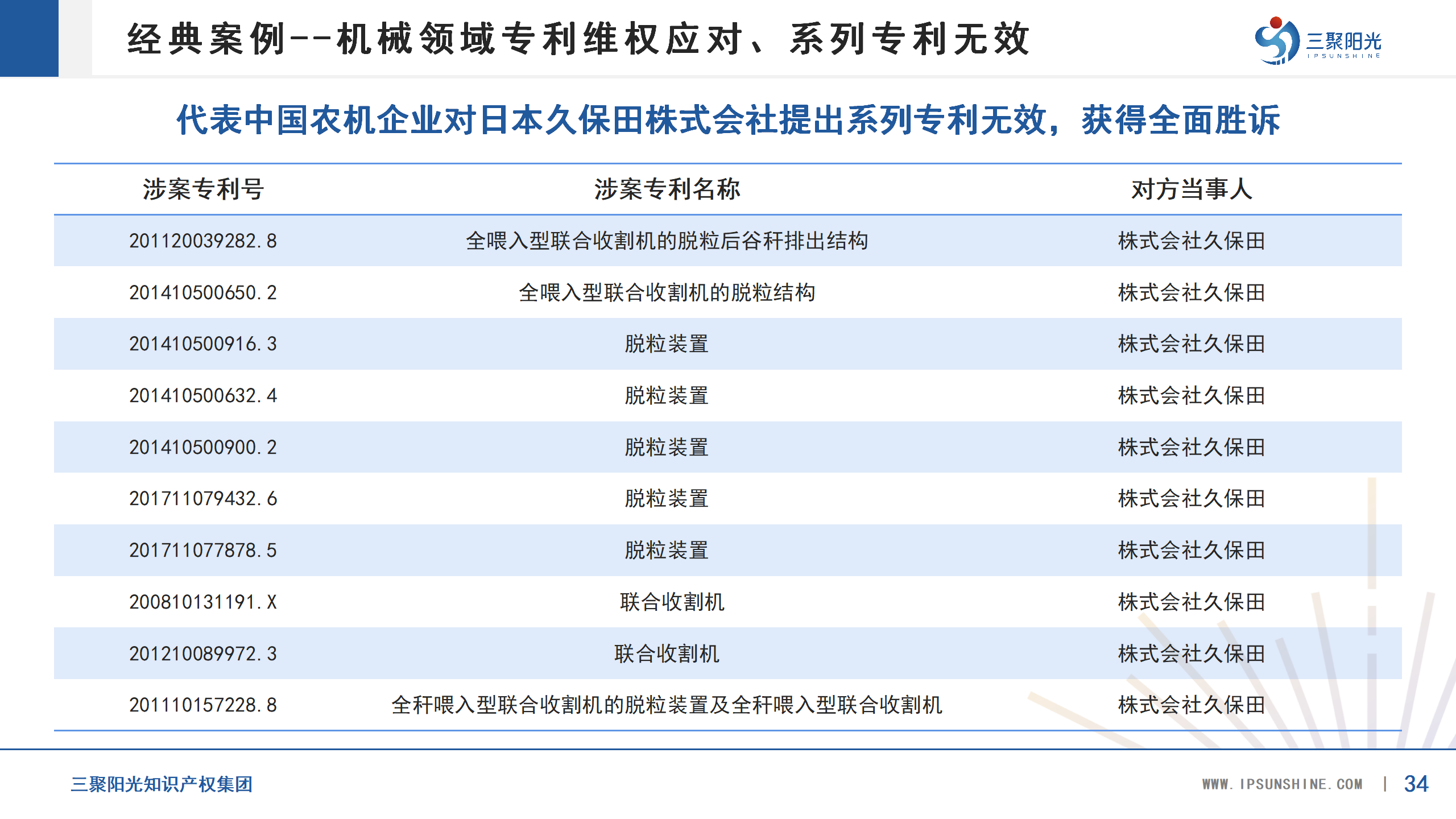 代表中國農(nóng)機企業(yè)對日本久保田株式會社提出系列專利無效,獲得全面勝訴
