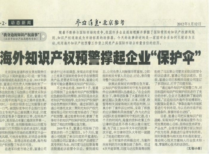 2009年北京市海外知識(shí)產(chǎn)權(quán)預(yù)警項(xiàng)目,國(guó)電富通公司針對(duì)火力發(fā)電廠除渣系統(tǒng)對(duì)印度開(kāi)展知識(shí)產(chǎn)權(quán)海外預(yù)警工作,由三聚陽(yáng)光公司具體實(shí)施。與此同時(shí),國(guó)電富通公司相關(guān)產(chǎn)品進(jìn)入印度市場(chǎng)投標(biāo)。