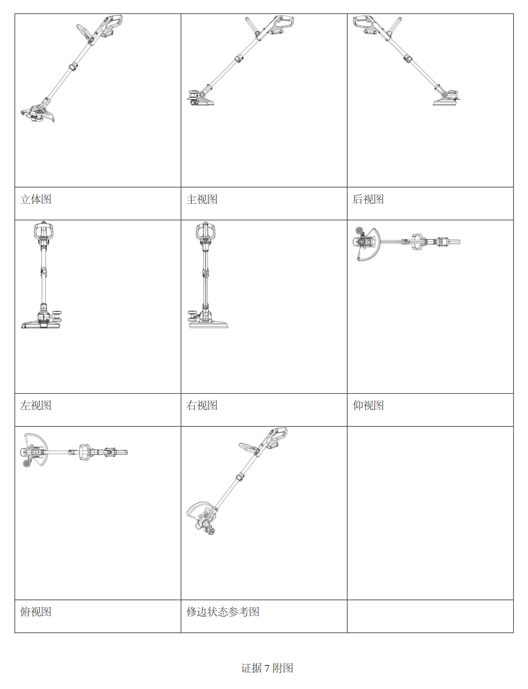 通過涉案專利與證據(jù) 7 的對比可知,兩者的整體部件組成及各部件的形狀和相對位置基本一致,上部為手柄,中間為桿體、桿體下方為電機、電機下方為鈍角扇形擋草板,二者相同點使得兩者給一般消費者帶來了相似的整體視覺效果。一般消費者經(jīng)過對涉案專利與證據(jù) 7的整體觀察可以看出,二者的差別對于產(chǎn)品外觀設計的整體視覺效果均不足以產(chǎn)生顯著影響,涉案專利與證據(jù) 7 相比不具有明顯區(qū)別,涉案專利不符合專利法第 23 條第 2 款的規(guī)定。