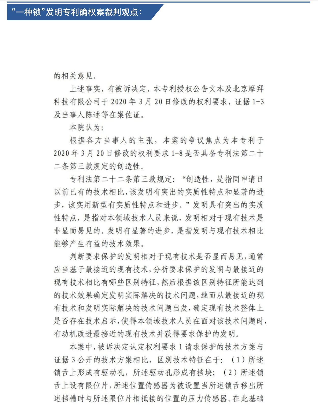 該案涉案專(zhuān)利“一種鎖”專(zhuān)利號(hào)為201510886031.6,專(zhuān)利權(quán)人是北京摩拜科技有限公司,北京小桔科技有限公司(即滴滴出行)曾作為無(wú)效請(qǐng)求人申請(qǐng)宣告該專(zhuān)利無(wú)效。在專(zhuān)利被維持有效后,北京小桔科技有限公司的起訴被北京知識(shí)產(chǎn)權(quán)法院駁回。