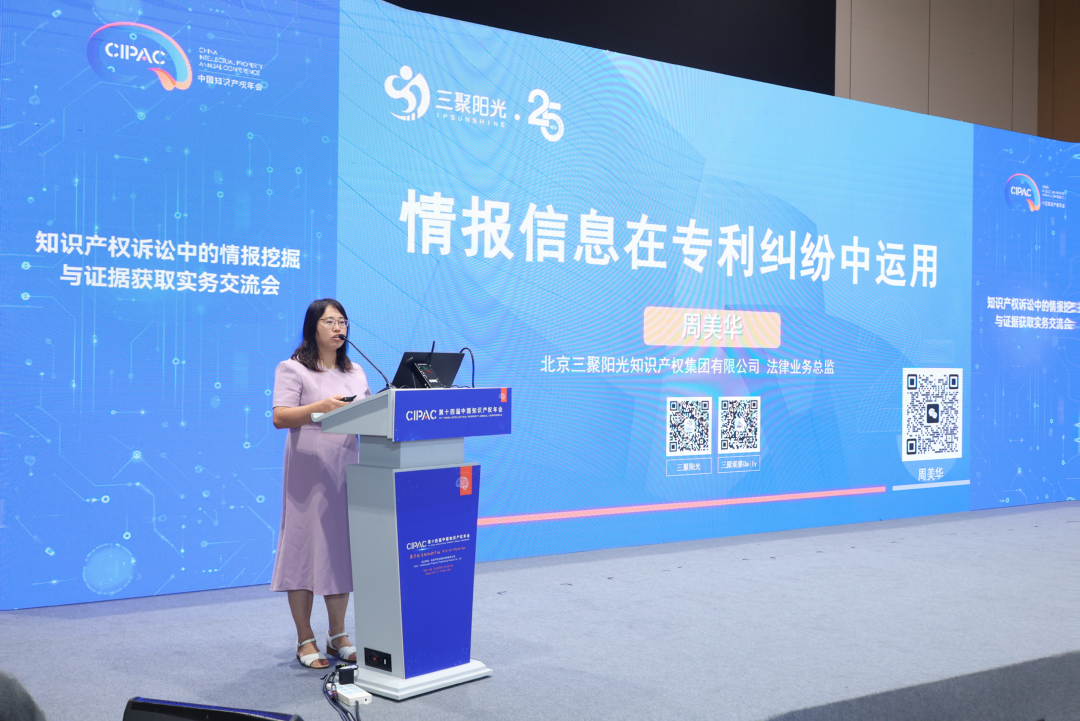 在本次交流會(huì)的核心分享環(huán)節(jié),三聚陽(yáng)光知識(shí)產(chǎn)權(quán)集團(tuán)法律業(yè)務(wù)總監(jiān)周美華律師發(fā)表了題為《情報(bào)信息在專(zhuān)利糾紛中運(yùn)用》的精彩演講,聚焦專(zhuān)利訴訟中的取證策略制定,深入剖析了情報(bào)分析在知識(shí)產(chǎn)權(quán)維權(quán)實(shí)踐中的關(guān)鍵價(jià)值。