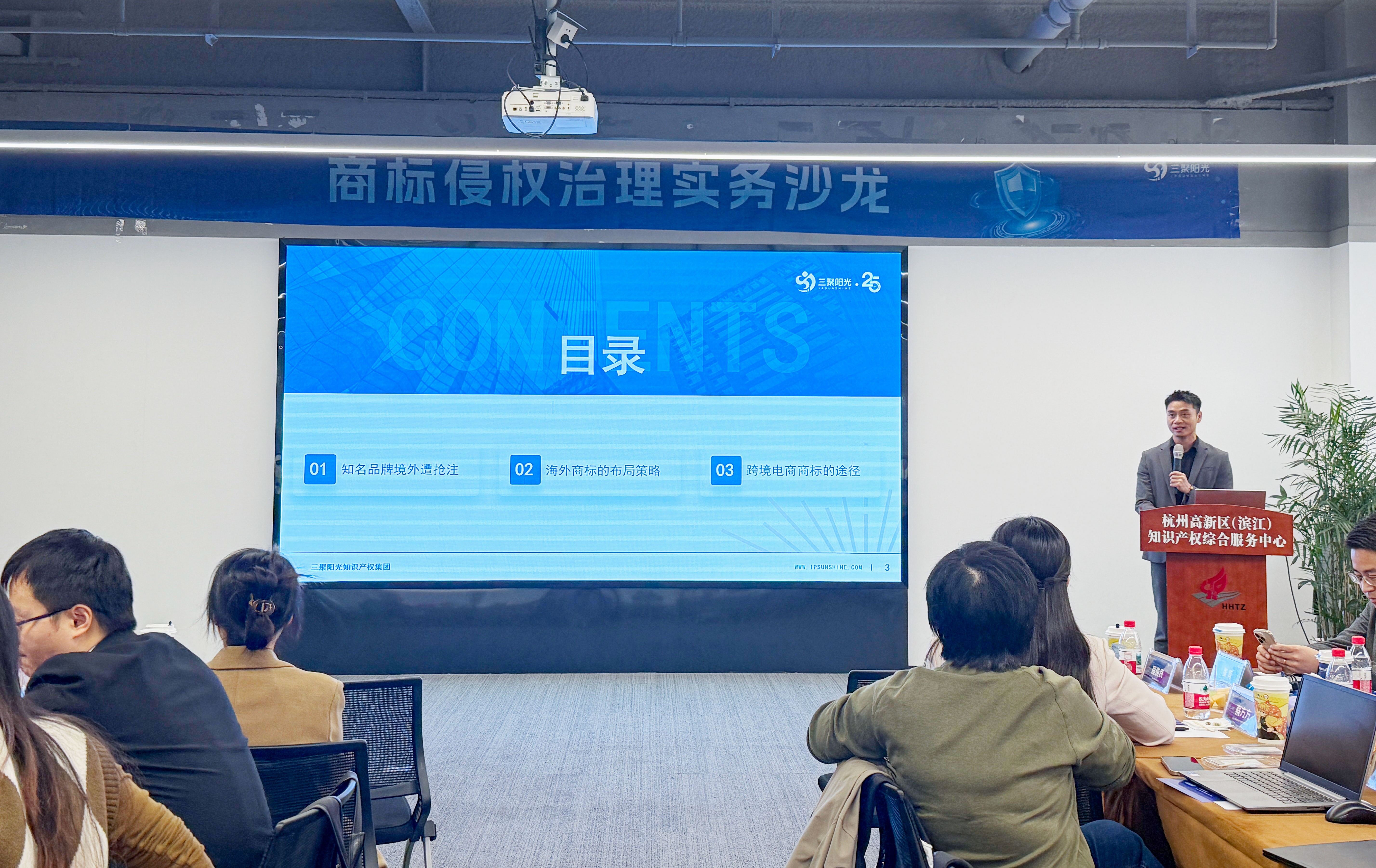 近日,由浙江省知識產權保護中心、杭州高新區(qū)(濱江)市場監(jiān)督管理局指導,杭州市知識產權促進會、浙江省中小企業(yè)協(xié)會知識產權專委會主辦,三聚陽光承辦的“品牌護航 商標侵權治理實務沙龍”在杭州順利舉辦。浙江省知識產權保護中心服務發(fā)展部部長張晉茂,杭州市知識產權促進會秘書長、杭州市知識產權交易服務中心總經理程俊良受邀出席,三聚陽光浙江區(qū)副總經理張鳴主持沙龍。