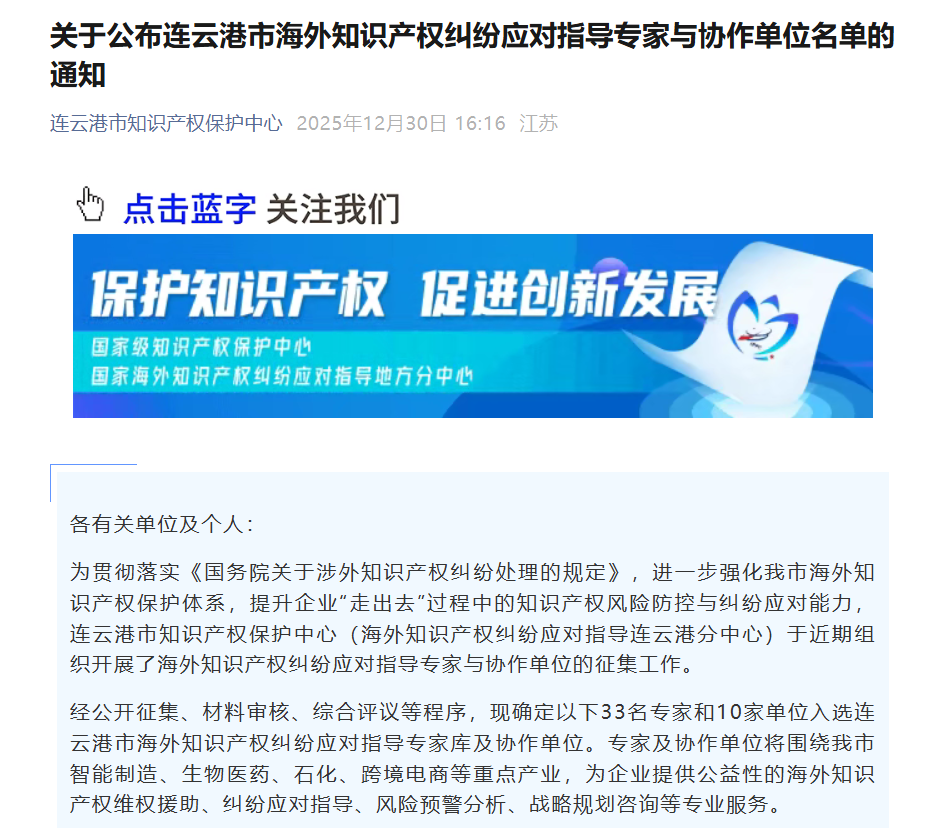 據(jù)規(guī)定,協(xié)作單位與入選專家將圍繞智能制造、生物醫(yī)藥、石化、跨境電商等重點產(chǎn)業(yè),提供公益性海外知識產(chǎn)權(quán)維權(quán)援助、糾紛應(yīng)對指導(dǎo)、風(fēng)險預(yù)警分析、戰(zhàn)略規(guī)劃咨詢等專業(yè)服務(wù),并在后續(xù)工作中進一步深化“專家領(lǐng)銜、機構(gòu)協(xié)同、精準(zhǔn)服務(wù)”的海外知識產(chǎn)權(quán)糾紛應(yīng)對指導(dǎo)體系建設(shè),服務(wù)高水平對外開放與“一帶一路”相關(guān)支點城市建設(shè)。