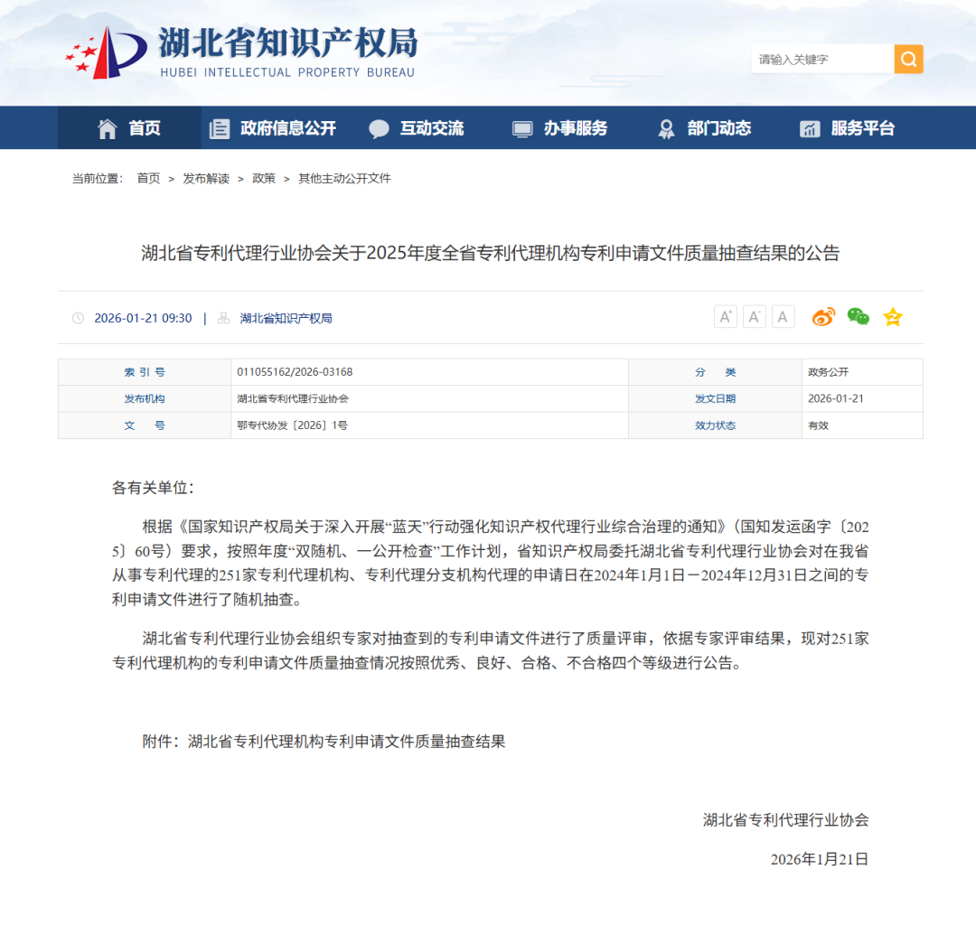 公告指出,本次抽查依據(jù)國家知識產(chǎn)權(quán)局“藍天”行動相關(guān)要求,并結(jié)合年度“雙隨機、一公開檢查”工作計劃,由湖北省知識產(chǎn)權(quán)局委托湖北省專利代理行業(yè)協(xié)會組織實施;抽查對象覆蓋在湖北從事專利代理的251家專利代理機構(gòu)及分支機構(gòu),抽查范圍為申請日介于2024年1月1日至2024年12月31日期間的專利申請文件,并按“優(yōu)秀、良好、合格、不合格”四個等級公布結(jié)果。