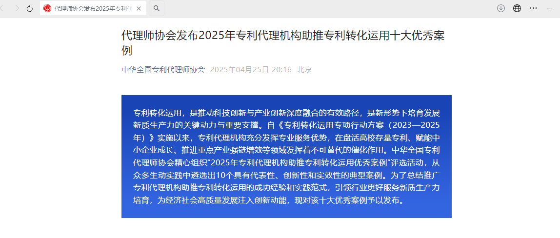 當前,我國正大力實施《專利轉(zhuǎn)化運用專項行動方案(2023—2025年)》,旨在打通知識產(chǎn)權(quán)創(chuàng)造、運用、保護、管理、服務(wù)全鏈條,加速創(chuàng)新成果的產(chǎn)業(yè)化進程。專利代理機構(gòu)作為連接創(chuàng)新主體與市場應(yīng)用的重要橋梁,所提供的專業(yè)服務(wù)對于盤活高校院所存量專利、賦能中小企業(yè)創(chuàng)新、推動重點產(chǎn)業(yè)強鏈增效具有不可替代的作用。中華全國專利代理師協(xié)會連續(xù)舉辦的優(yōu)秀案例評選活動,正是為了樹立行業(yè)標桿,推廣成功經(jīng)驗,引領(lǐng)專利代理行業(yè)更好地服務(wù)于新質(zhì)生產(chǎn)力的培育和高質(zhì)量發(fā)展。
