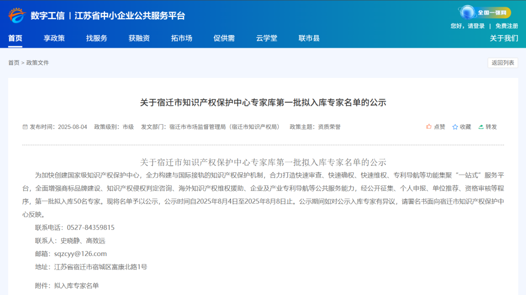 宿遷市知產(chǎn)保護(hù)中心專家?guī)於ㄎ挥凇翱焖賹彶椤焖俅_權(quán)—快速維權(quán)—專利導(dǎo)航”的一站式公共服務(wù)平臺(tái),重點(diǎn)覆蓋商標(biāo)品牌建設(shè)、侵權(quán)判定咨詢、海外維權(quán)援助與產(chǎn)業(yè)專利導(dǎo)航等方向,旨在以專家智力支撐地方創(chuàng)新主體高質(zhì)量發(fā)展。