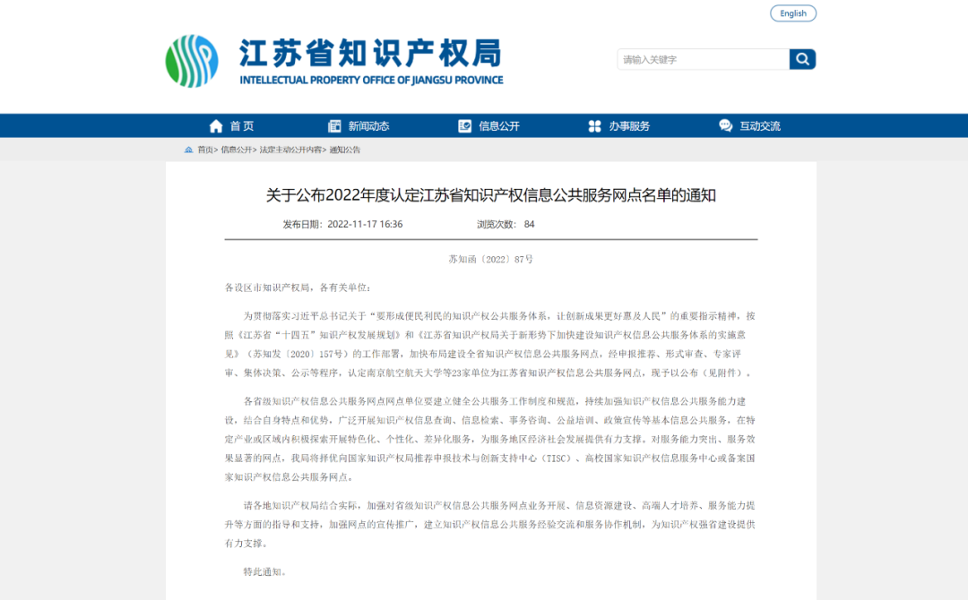 日前, 江蘇省知識產(chǎn)權(quán)局下發(fā)通知,公布了2022年度認定江蘇省知識產(chǎn)權(quán)信息公共服務(wù)網(wǎng)點的名單,無錫三聚陽光知識產(chǎn)權(quán)服務(wù)有限公司、南京航空航天大學(xué)、南京郵電大學(xué)等23家單位獲認定江蘇省知識產(chǎn)權(quán)信息公共服務(wù)網(wǎng)點。