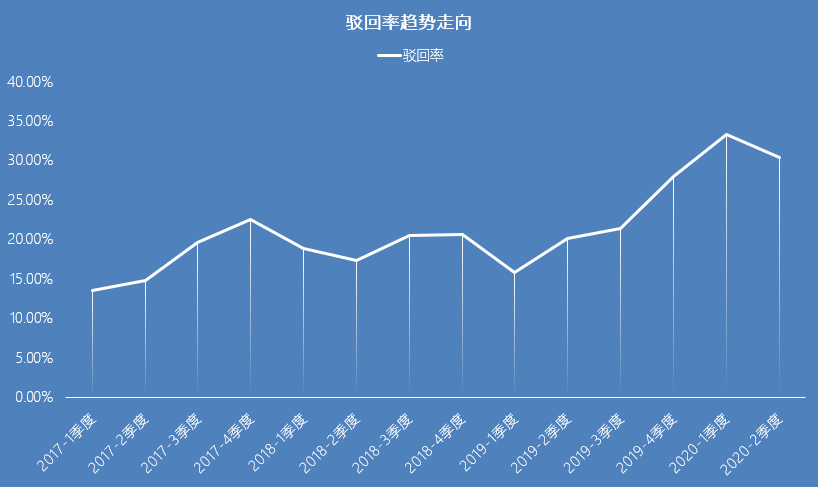 相較之下,撤回率近年來(lái)波動(dòng)明顯。如圖7、圖8所示,撤回率通常上半年高于下半年,2019年第一季度撤回率曾一度達(dá)到45.5%,而各年度第四季度撤回率則均出現(xiàn)較明顯下降,2020年第一季度撤回率與往年第一二三季度的均值差距不大,但第二季度撤回率下降明顯,僅為26.3%,略高于2017年第四季度視撤率谷值21.1%。