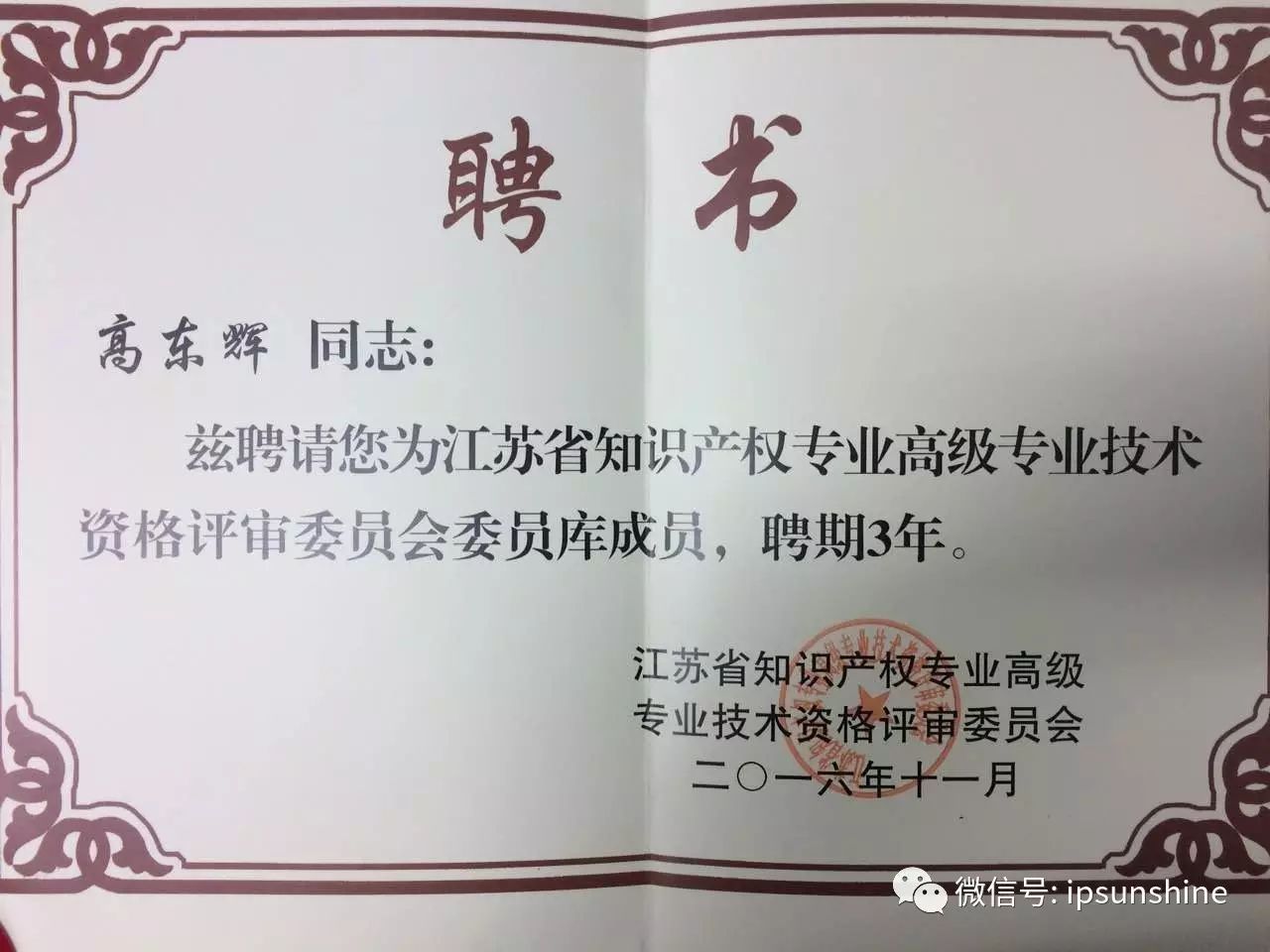 近日,江蘇省知識產權專業(yè)高級專業(yè)技術資格評審委員會發(fā)來聘書,聘請我司副總經理高東輝作為江蘇省知識產權專業(yè)高級專業(yè)技術資格評審委員會委員庫成員。