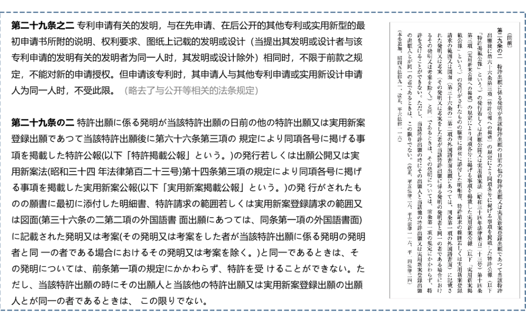 可以看出,在日本專利角度,上述二十九條第二款,由于涉及公知、先申請制度、新穎性,與第二十九條第一款新穎性條款、第三十九條新申請條款形成互補。這里不妨進行簡單對比——